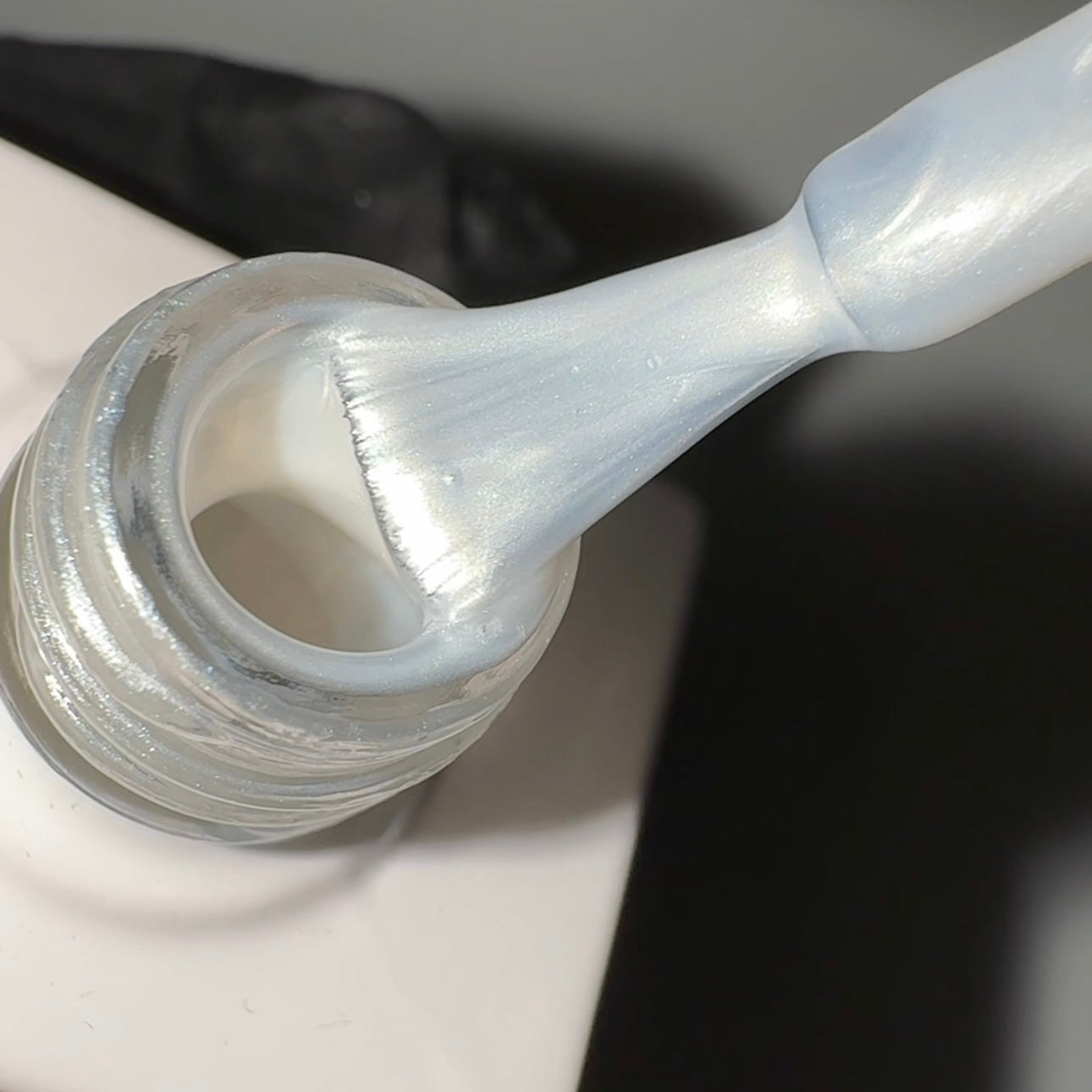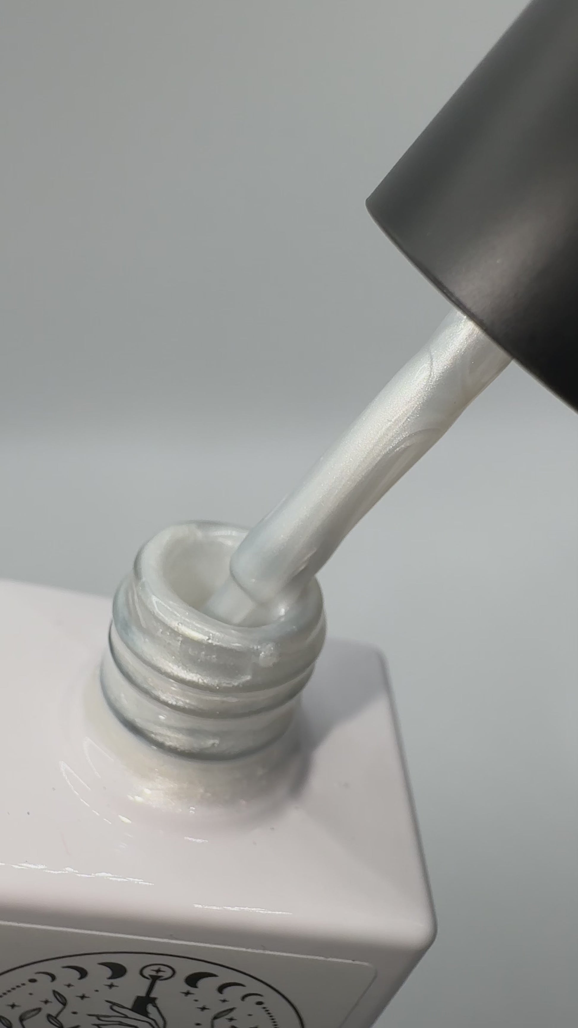 "Winter's Veil" gel polish is a pearlescent white with subtle gray/silverish undertones, reminiscent of the first snowfall of the colder months. It has a silky, satin finish but can also be used to create pearl nail designs/french tips as shown in the photos.